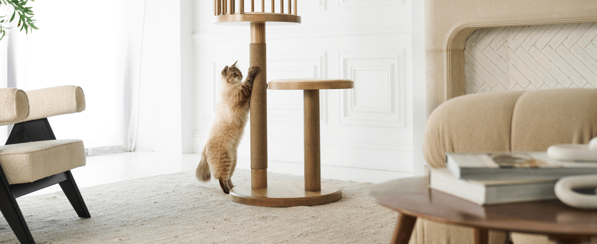 Example:Place the piece near a reading chair by a window. The chair remains the primary focal point, while the cat furniture becomes part of the same visual story. The eye moves naturally between the two.